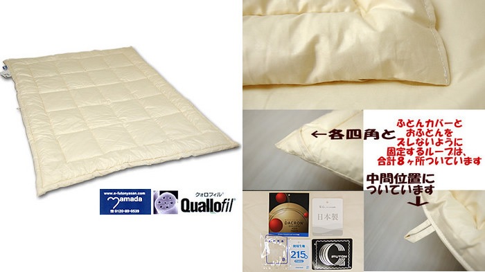 ふとんにカバーをかけてお届けいたします。お気軽にお申し付けくださいサイズキングロング:230×210cm・1.7kg、日本製生地・素材綿100%(205本以上打込み)、ループ(受けひも)8ヶ所付きダクロン「クォロフィル」アクア中綿(ポリエステル100%)カラーアイボリー