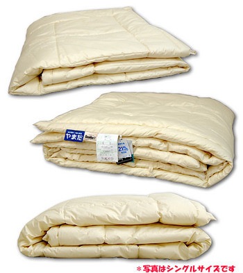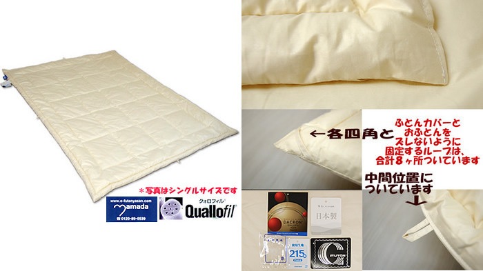 ふとんにカバーをかけてお届けいたします。お気軽にお申し付けくださいサイズセミダブルロング:170×210cm・0.8kg、日本製生地・素材綿100%(205本以上打込み)、ループ(受けひも)8ヶ所付きダクロン「クォロフィル」アクア中綿(ポリエステル100%)カラーアイボリー
