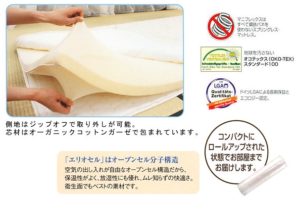 今お使いのお布団やスプリングマットの上に置くだけで、マニフレックスの熟睡効果を体感できるという日本限定モデルの新製品です。折りたたんで押入れ収納もできます。
