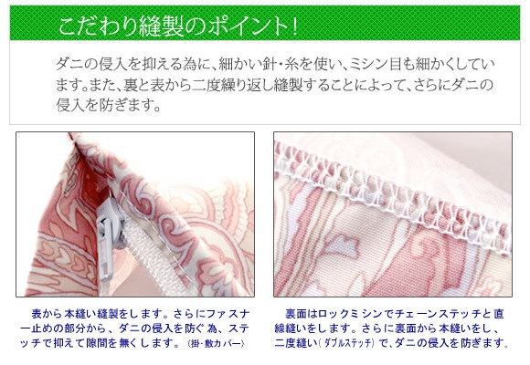 また、裏と表から二度繰り返し縫製するダブルステッチによって、さらにダニの侵入を防ぎます。