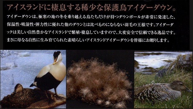 稀少な保護鳥アイダーダックは美しい自然豊かなアイスランドで繁殖、棲息していますので、大変安全で信頼できる逸品です。 極寒の地の冬を乗り越える鳥たちだけが持つダウンボールが発達した、保温性・吸湿性・弾力性に優れた他のダウンとは比べものにならない羽毛の王様です。
